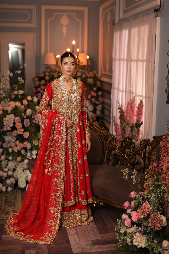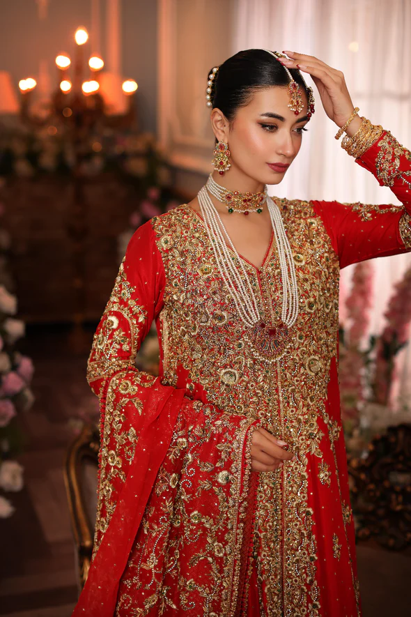 This royal red raw silk bridal has gold and antique zardozi work with jewel stones. It comes with a heavy Lengha, brocade borders, and a hand-embellished shawl.