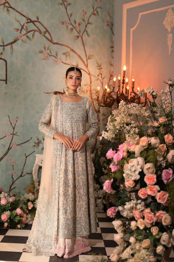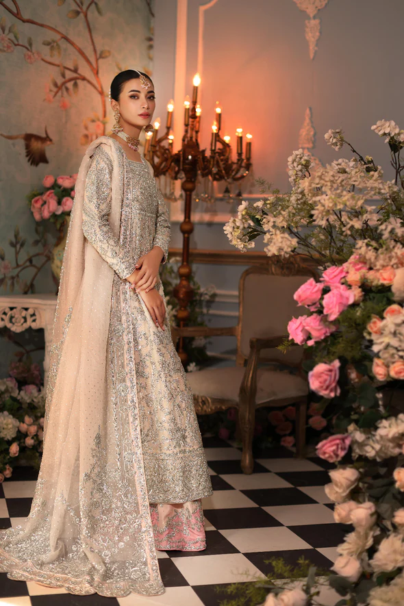 This teapink raw silk and organza bridal features silver zardozi handwork, giving it a luxurious, elegant, and beautifully intricate design.