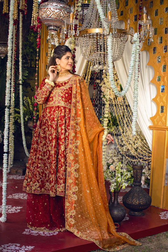 This maroon and gold brocade bridal kalidaar is beautifully embellished with zardozi, dabka, sequins, naqshi, gota, and gold zari. It comes with a cotton net lehnga featuring delicate gold handwork and a burnt orange masuri chiffon dupatta, finished with handcrafted borders and botis for a regal bridal look.