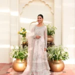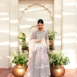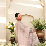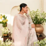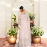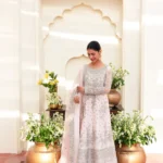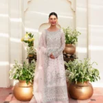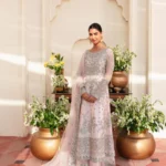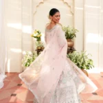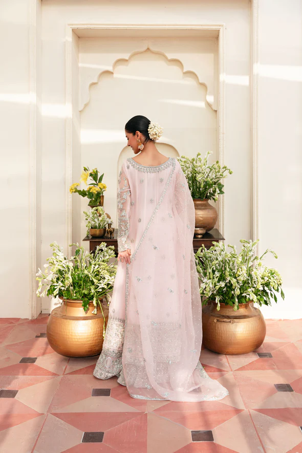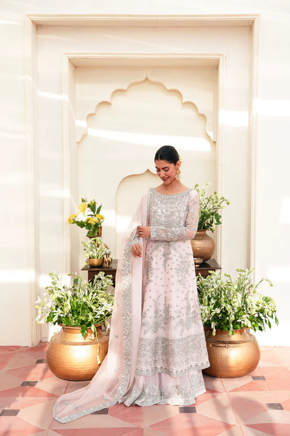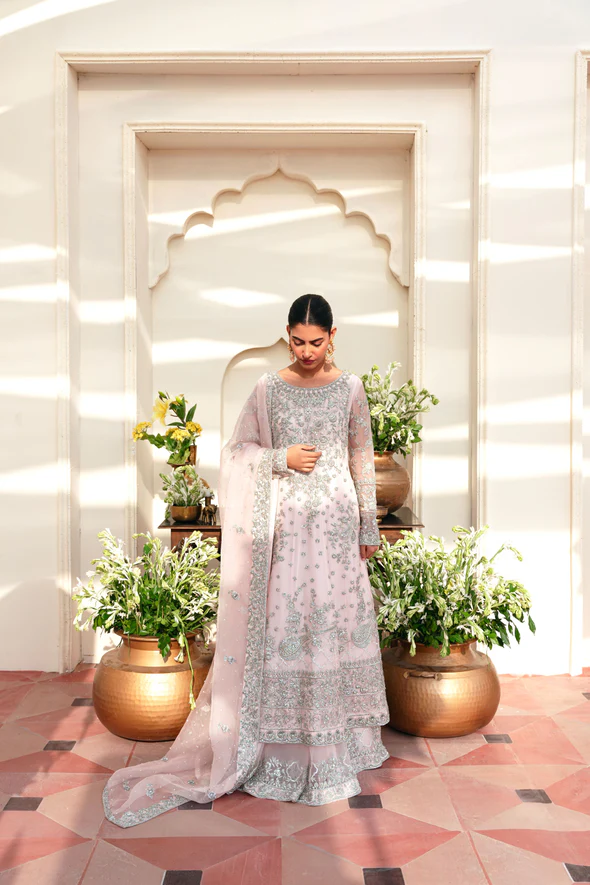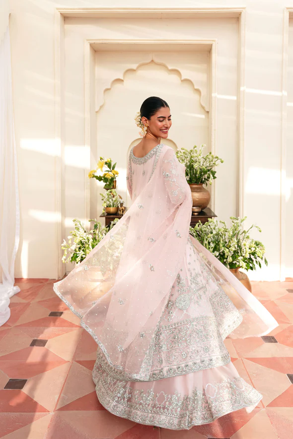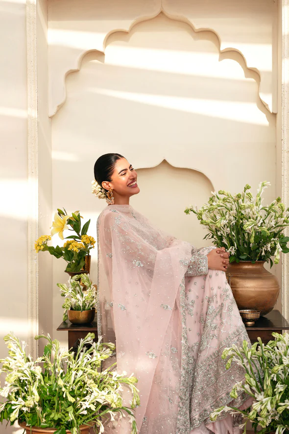 This blush pink bridal dress is crafted from pure tissue, detailed with silver handwork, flowy kalidaar style, silk finishings, heavy borders, and an embellished dupatta with sequins.