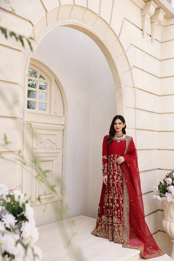 This deep maroon raw silk bridal features heavy hand embellishments with zardozi floral jhal, a detailed neckline, and daaman border. It comes with a matching organza shawl and chooridar for a graceful, classic look.