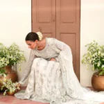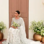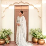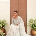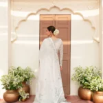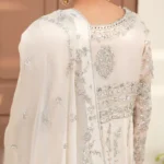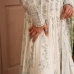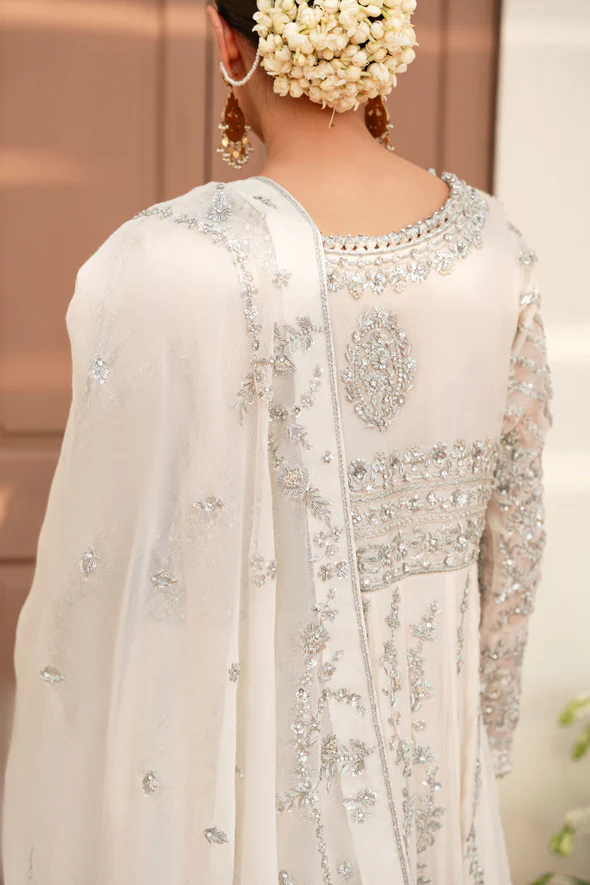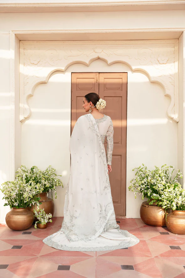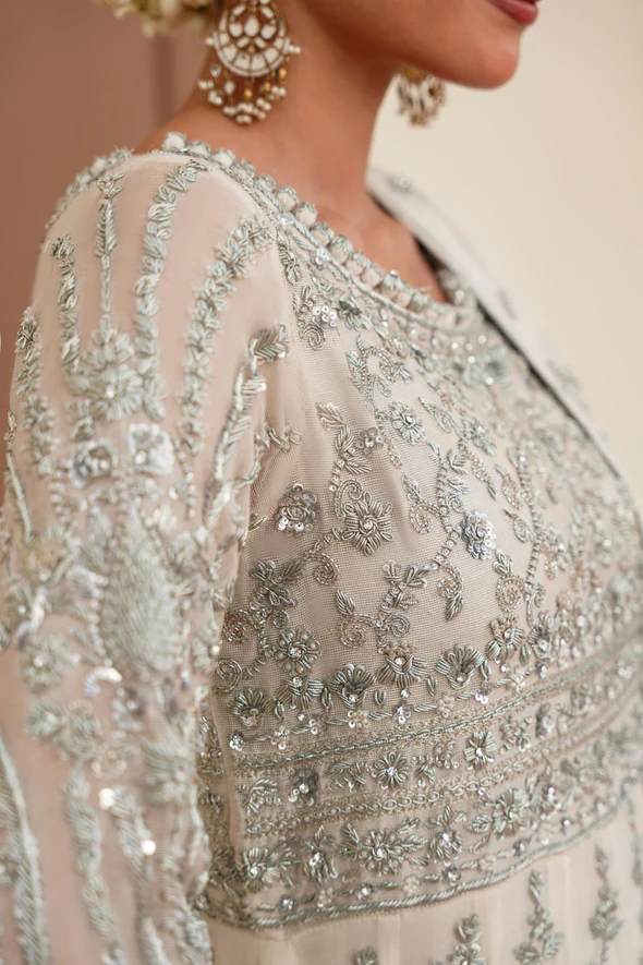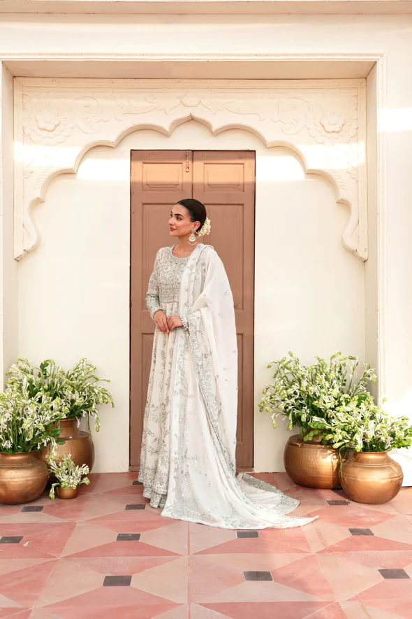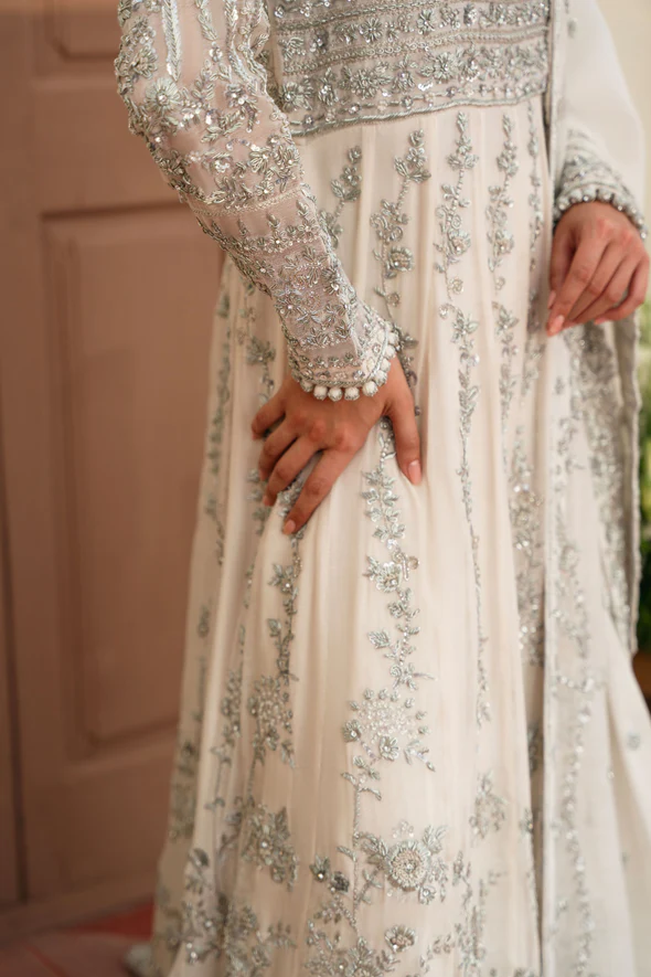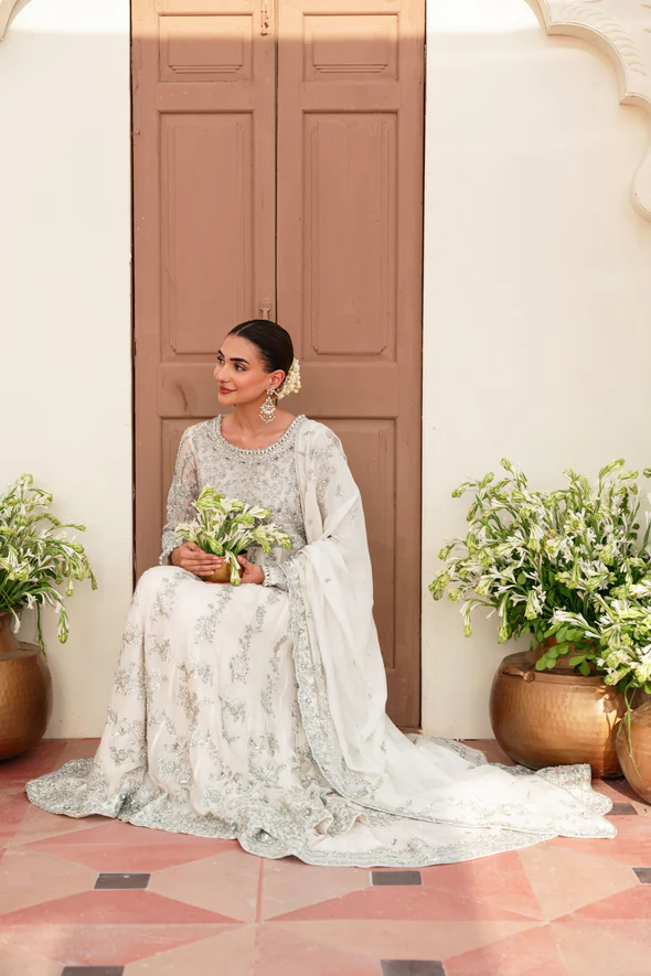 This ivory bridal dress is crafted from soft tissue net, decorated with silver handwork, flowy kalidaar style, silk finishings, heavy borders, and an embellished dupatta with sequins.