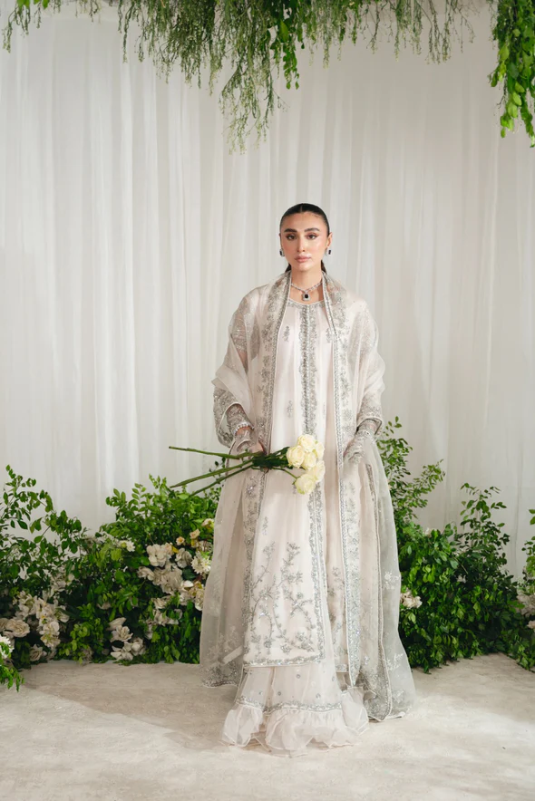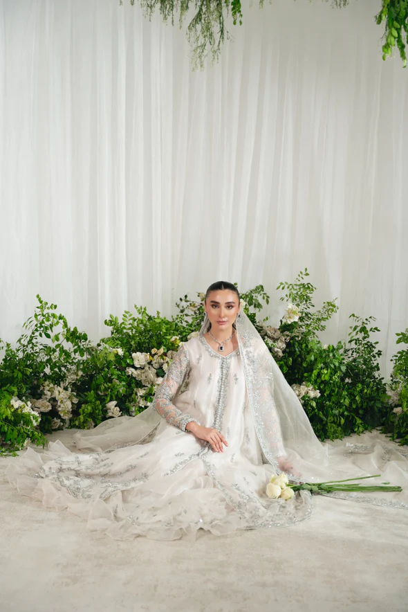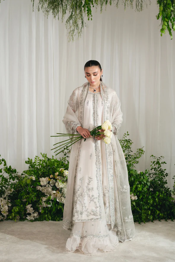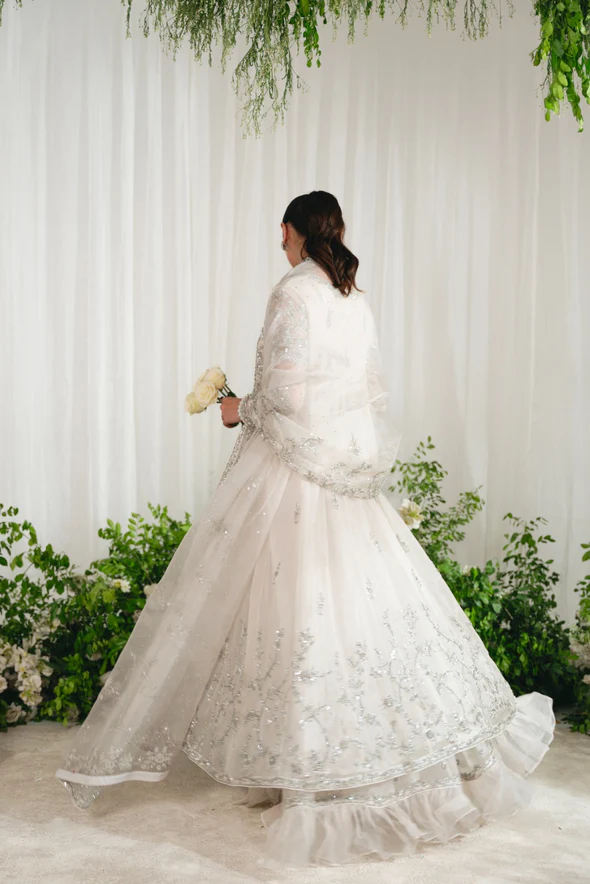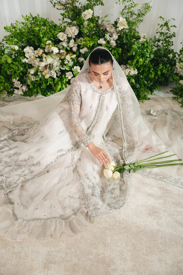 This Nikkah bridal dress is made of pure organza, adorned with silver zardozi work, flowy open kalidaar, tissue shawl, panelled skirt, and intricate hand embellishments.